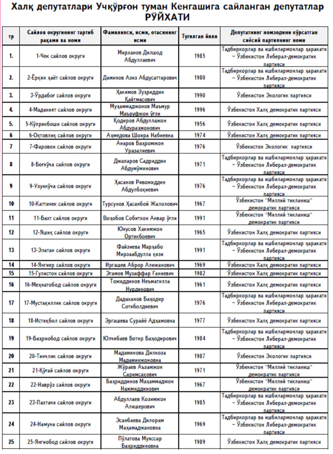 Наманган вилоятидаги Халқ депутатлари Учқўрғон туман Кенгашига сайланган депутатлар