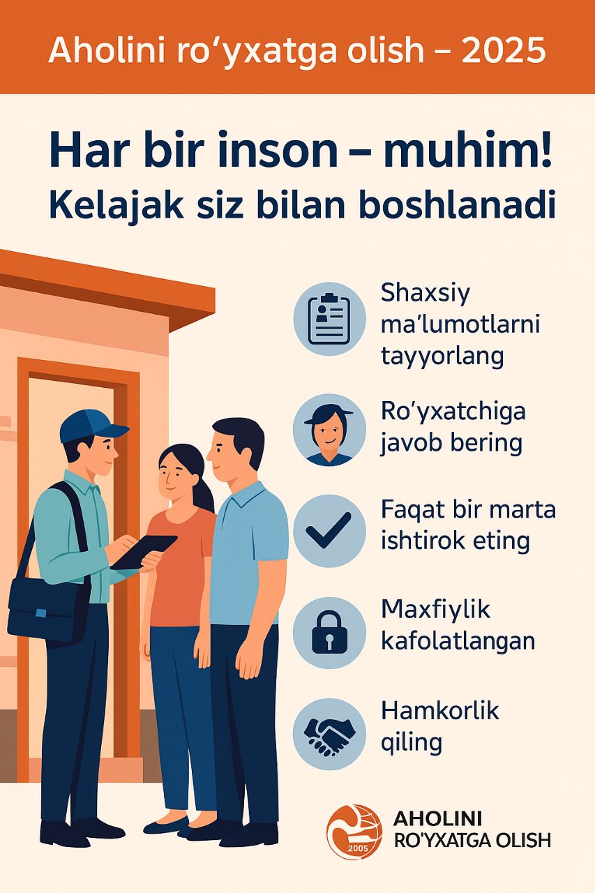 O‘ylab ko‘ring: siz yashayotgan mahallada maktab yetishmaydi, shifokorlar kam, transport qatnovi kamdan-kam. Shu muammolarning asosiy sababi nimada deb o‘ylaysiz?Yechim shunda: aholini ro‘yxatga olish!Bu qanday foyda beradi?🏥 1. Shifoxona kerakmi? Shahar yoki qishloq bo‘lishi farq qilmaydi!Agar aholining soni, yoshi va sog‘lig‘i haqida aniq ma’lumot bo‘lsa, qayerga qanday shifoxona kerakligi aniqlanadi. Masalan, keksalar ko‘p yashaydigan hududga yurak va qandli diabet shifoxonasi kerak. Bolalar ko‘p bo‘lsa – pediatrlar soni oshiriladi.📚 2. Bolalar maktabda siqilib o‘tiryaptimi?Ro‘yxatga olish orqali yoshlar soni, maktabga boradiganlar soni ma’lum bo‘ladi. Natijada, yangidan maktablar quriladi, o‘qituvchilar soni ko‘paytiriladi. Har bir bola qulay sharoitda o‘qiydi.🚌 3. Jamoat transporti kammi?Aholining zichligi va harakatlanish yo‘nalishlari tahlil qilinadi. Shunga qarab avtobuslar soni ko‘paytiriladi, yangi yo‘nalishlar ochiladi. Ro‘yxatga olish sizga tezroq va qulayroq manzilingizga yetib borish imkonini beradi.💸 4. Davlat yordamidan kimlar foydalanadi?Ayniqsa, kam ta’minlangan oilalar, yolg‘iz keksalar va nogironligi bo‘lgan fuqarolar haqida aniq ma’lumot kerak. Ro‘yxatga olish orqali yordam kimga kerakligini aniqlash osonlashadi, yordam bevosita sizga keladi.🏘 5. Yangi uylar, yangi imkoniyatlar!Aholi soni oshsa – uy-joyga ehtiyoj ham oshadi. Ro‘yxatga olish bu ehtiyojni aniq ko‘rsatadi. Yangi uylar, arzon ipoteka loyihalari – barchasi sizning ishtirokingizga bog‘liq.Bu jarayon xavfsiz va maxfiy!Siz haqingizdagi ma’lumotlar hech qayerda e’lon qilinmaydi. Faqat raqamlar sifatida qayd etiladi. Ismingiz, manzilingiz, shaxsiy ma’lumotlaringiz maxfiy saqlanadi.